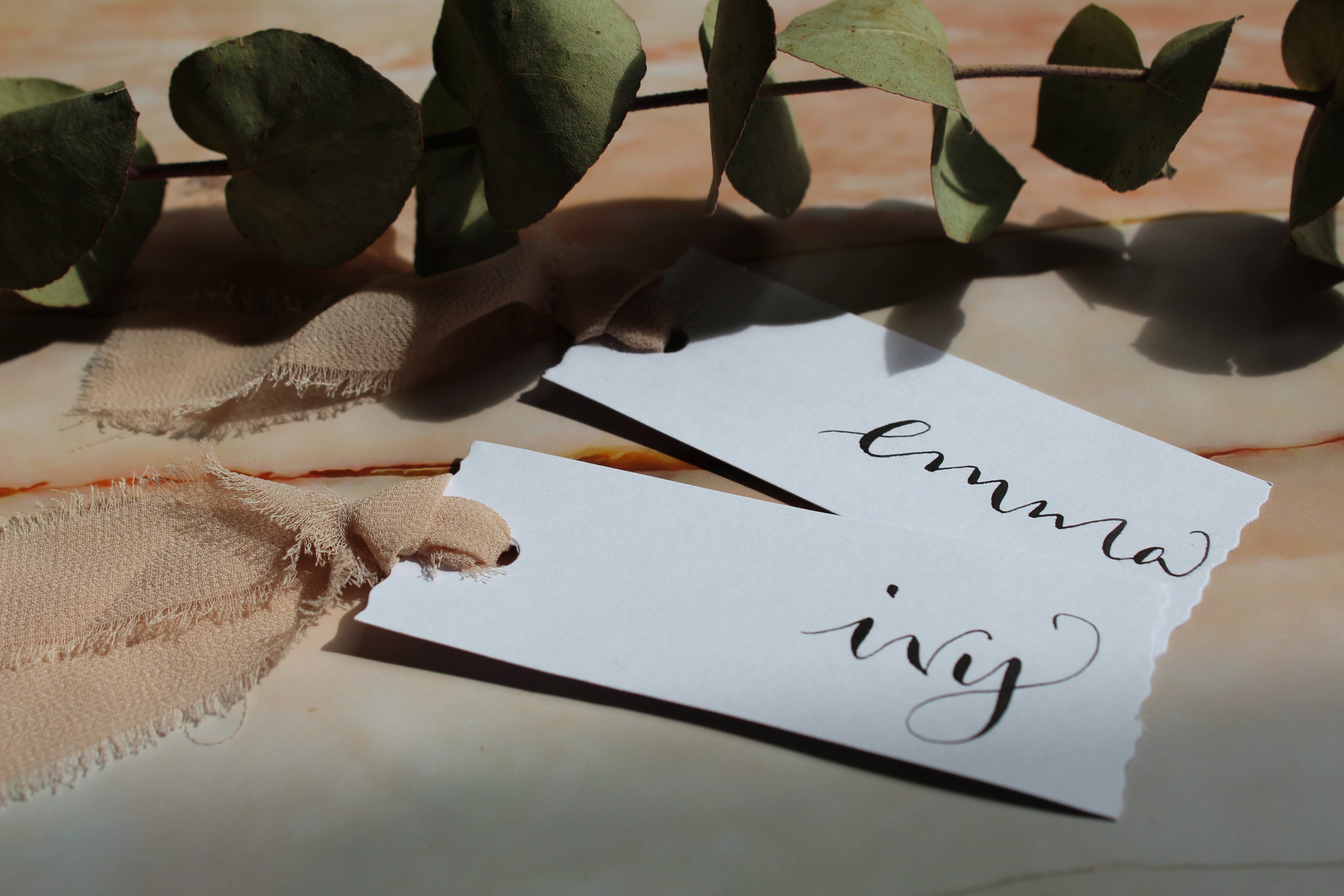 We offer calligraphy in a variety of modern styles, bringing a bespoke touch to cards, printed materials, products, and packaging. We can provide stationery and print for personalisation, or work directly with materials you supply. Every detail is carefully considered so we carry out in-house tests before each event to ensure the ink, paper, or surface pairings are flawless.